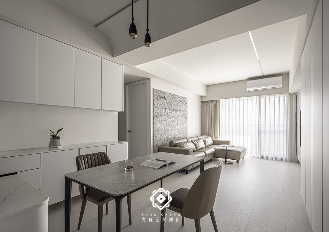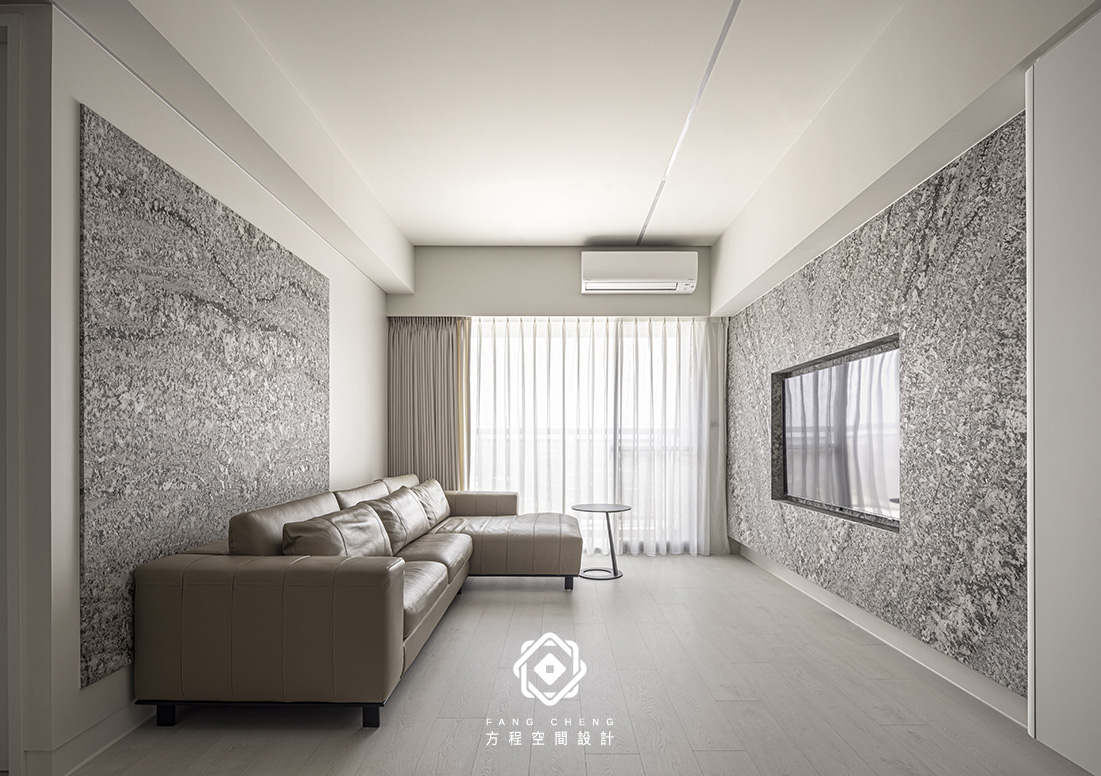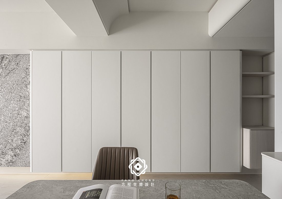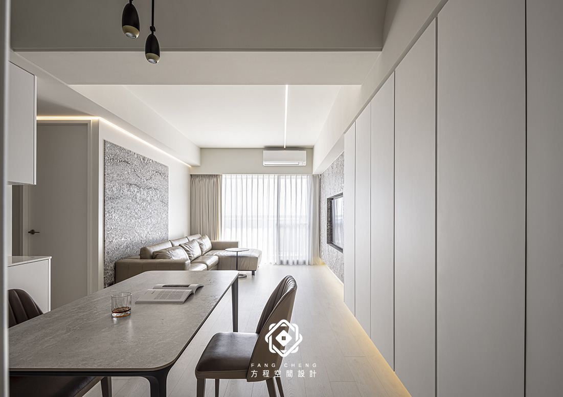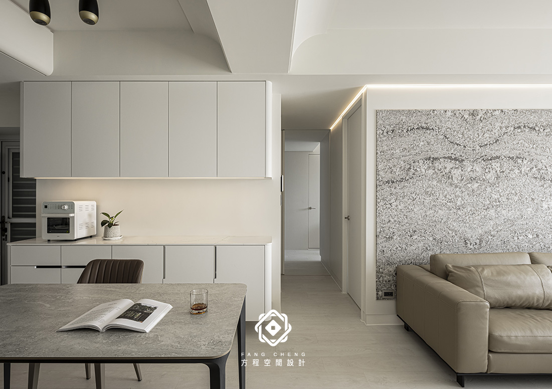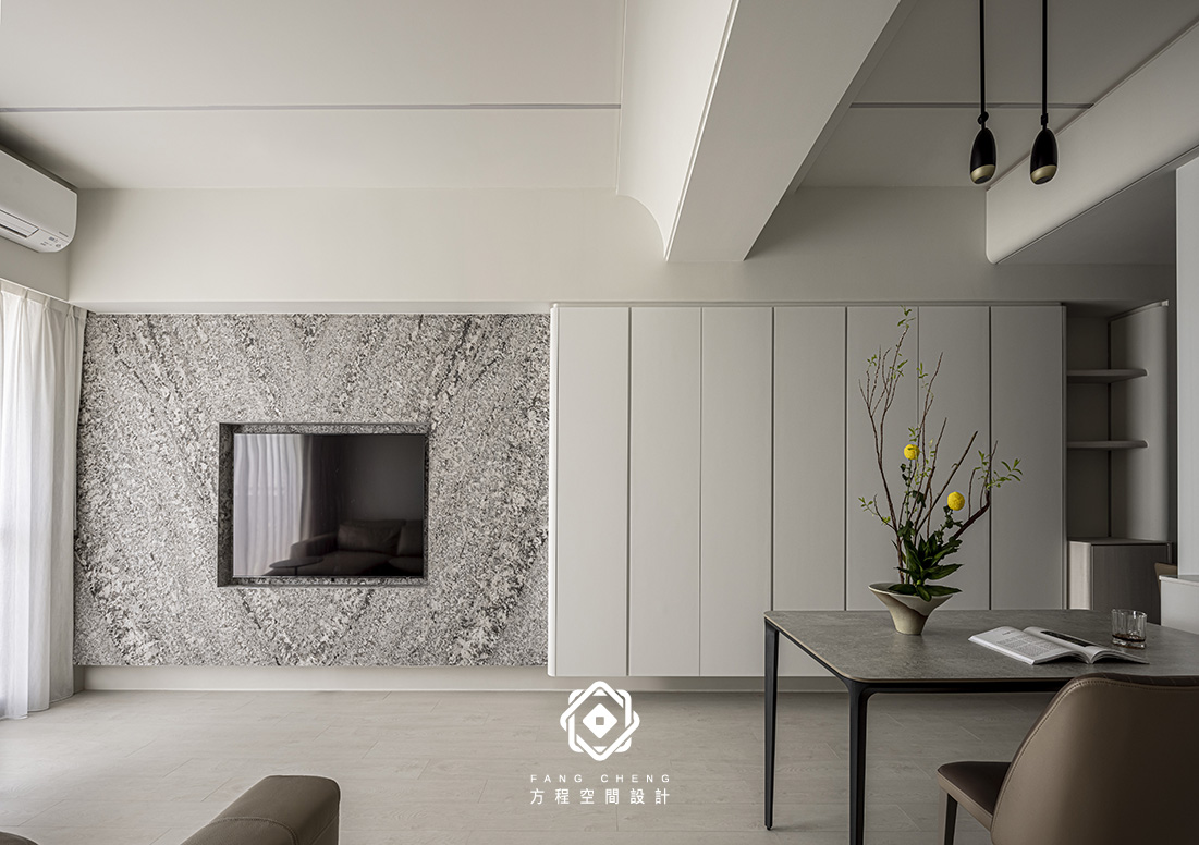 石材的細膩肌理與俐落的收納櫃相互對話,勾勒安定的節奏