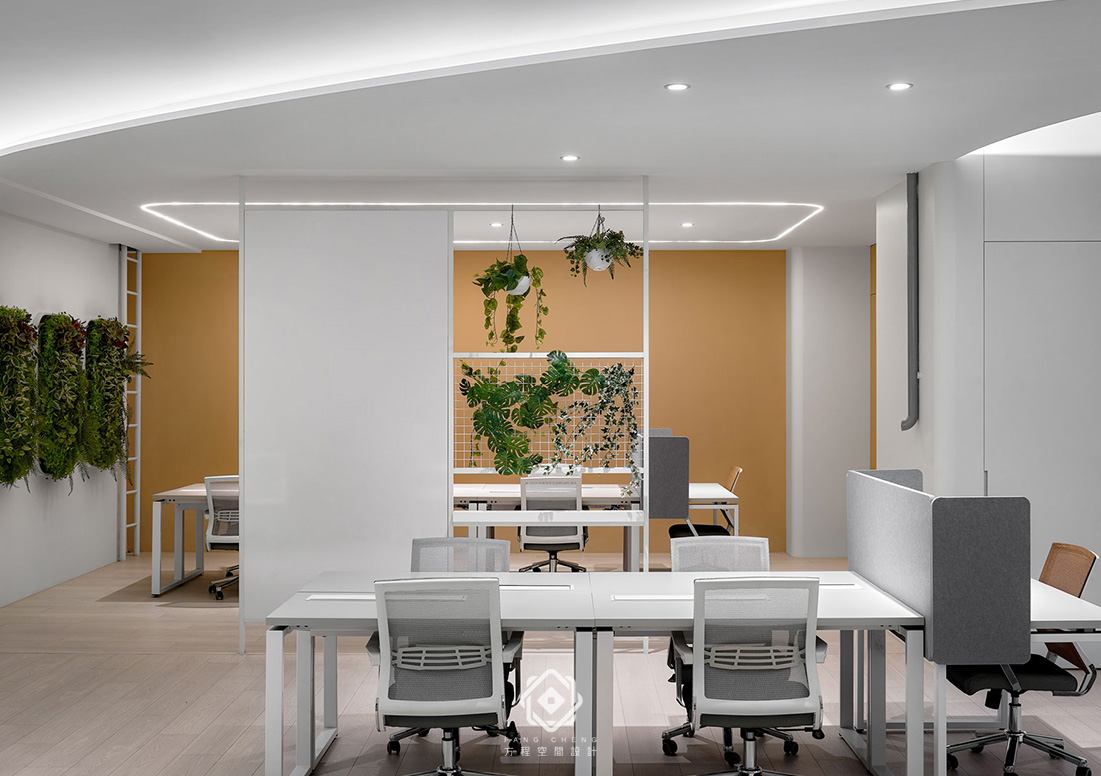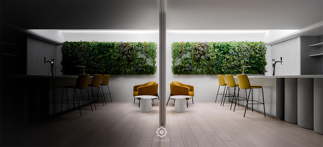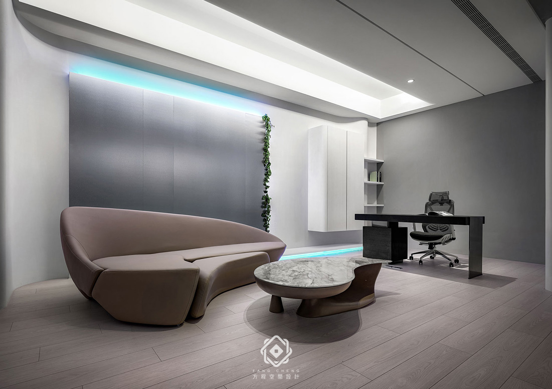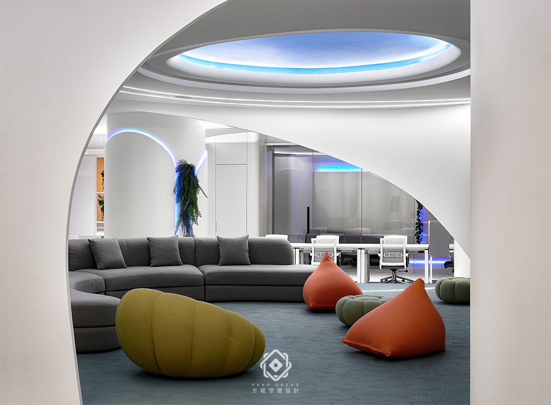 隨興的軟墊與綠意點綴,為科技感的氛圍中增添些許自在與溫暖