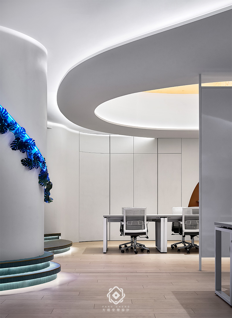 天花板的藍光穹頂宛如藍天,為空間注入無垠的想像